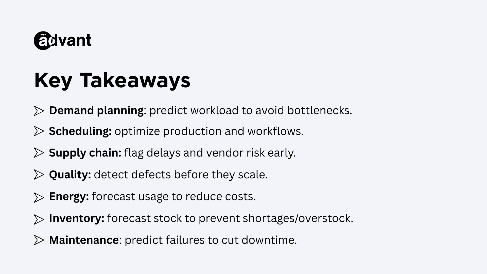High-impact areas: forecasting, churn, supply chain, workforce, finance.